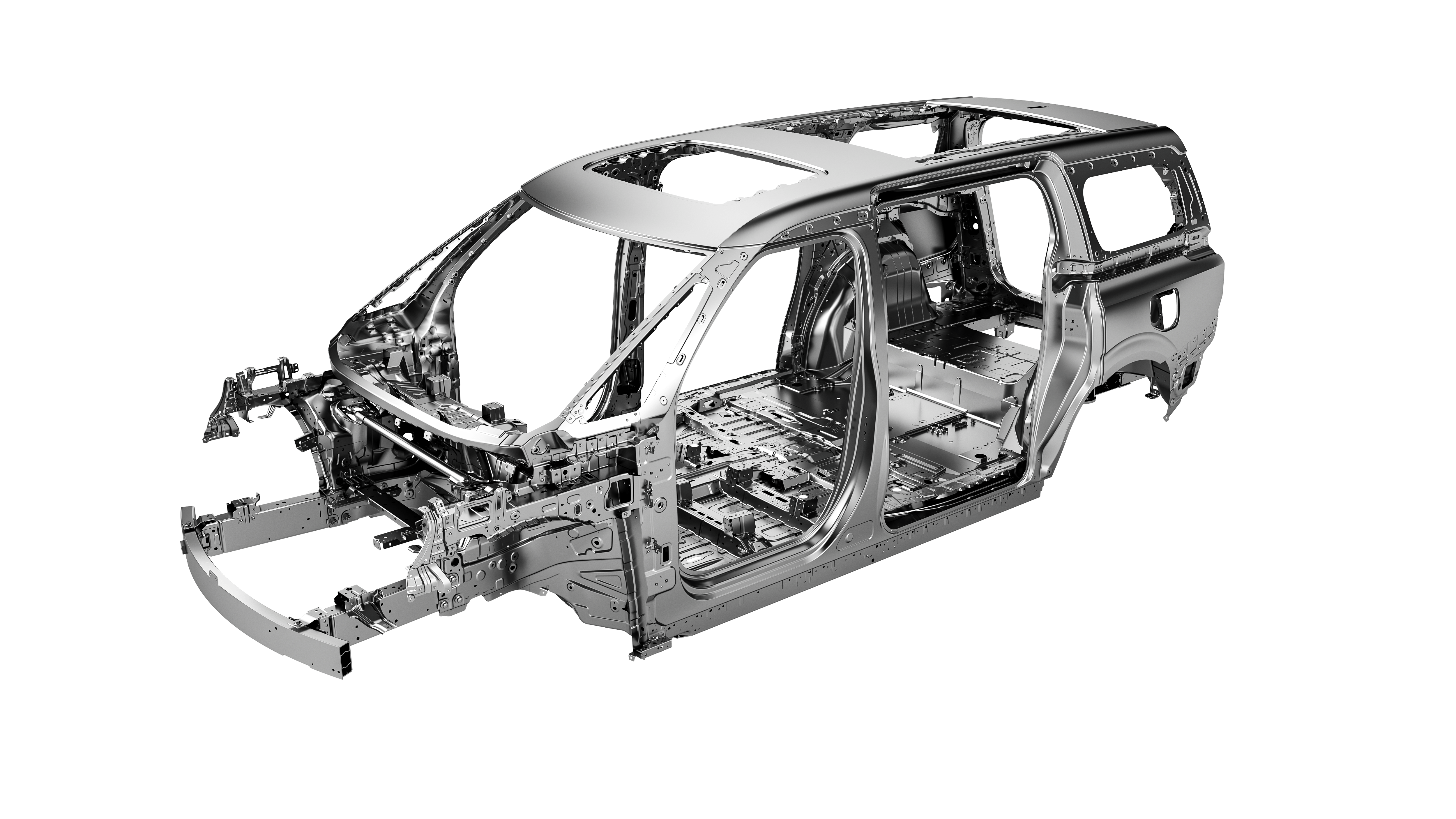 Single-piece rear-end aluminum. A 7200-ton giant die-casting machine is used to produce the strong, sturdy rear end.