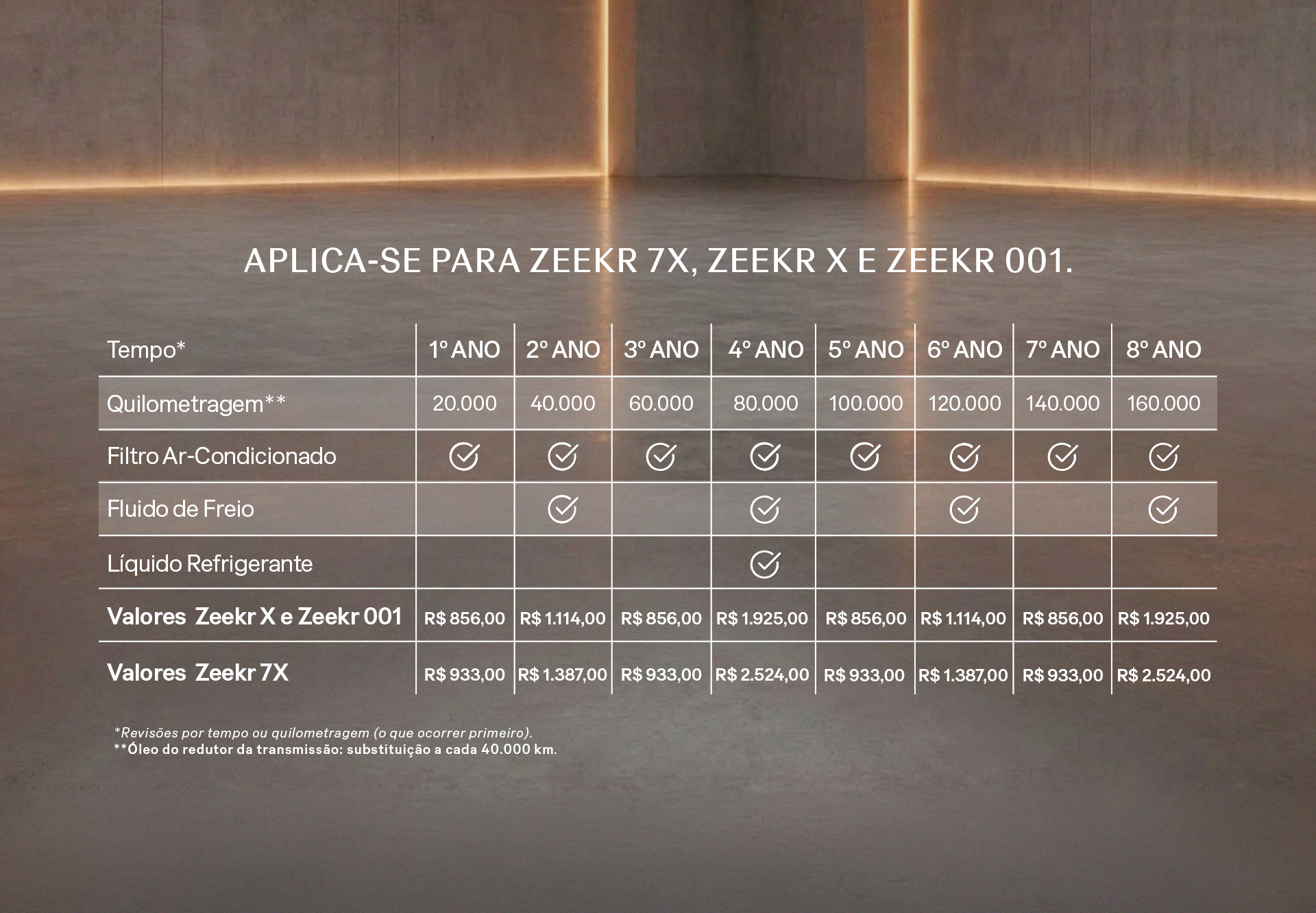 Disponibilizamos suporte e serviços exclusivos 24 horas por dia, 7 dias por semana. Este serviço está à sua disposição para emergências, como troca de pneus, reboque até o posto de recarga ou até a concessionária ZEEKR mais próxima. Para mais detalhes, consulte as condições descritas no manual do seu veículo.